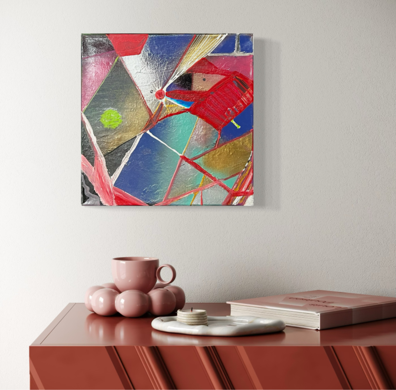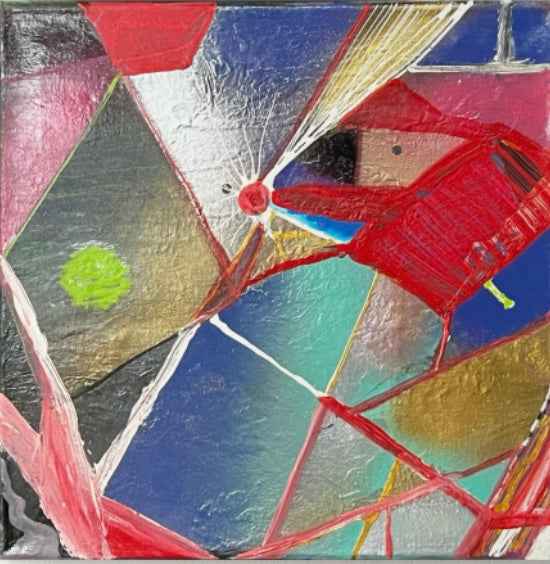 is a vivid exploration of geometry, color, and motion. Radiating lines intersect across the canvas, breaking the surface into angular, prism-like shards. Each segment holds a bold expression of color—metallic silvers, glowing greens, electric blues, and deep reds—creating a composition that is both chaotic and controlled
