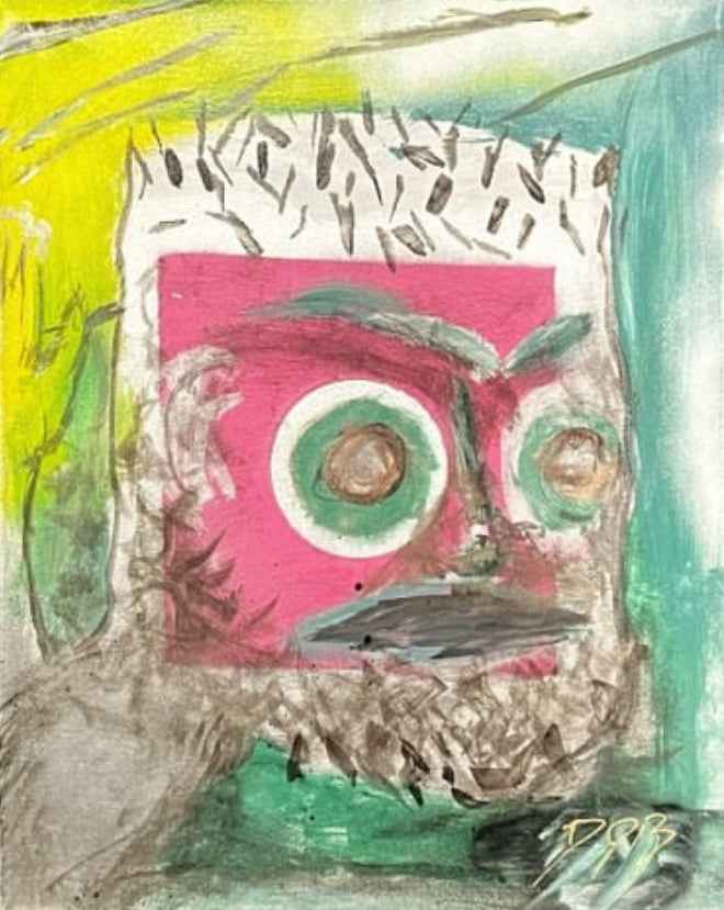 This striking mixed-media-style painting captures an intense, otherworldly face, rendered with a raw and expressive aesthetic. A vivid crimson square dominates the central facial region, housing hypnotic, circular eyes rimmed in green and brown, giving the figure an unsettling, unblinking stare.
